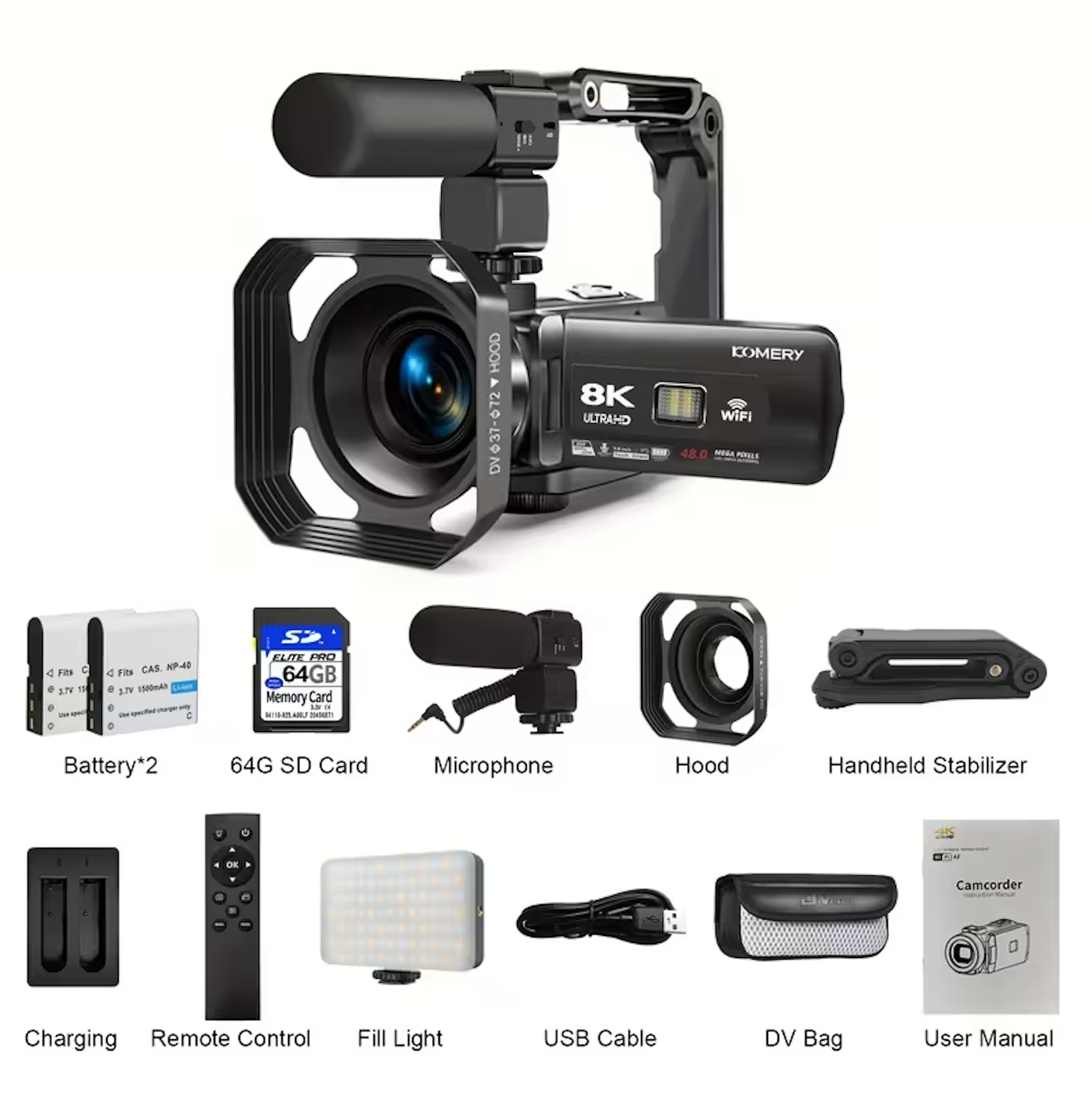 8K 48MP 18X Digital Zoom WiFi Night Vision Handheld Digital Camcorder - with Microphone/Stabilizer/Lens Hood, LED Video Light, 3.0-inch Touch IPS Screen for Vlogging, 2.4G Remote Control, 64G SD Card and two batteries. A perfect gift for graduation, birthdays, Thanksgiving, and Christmas.